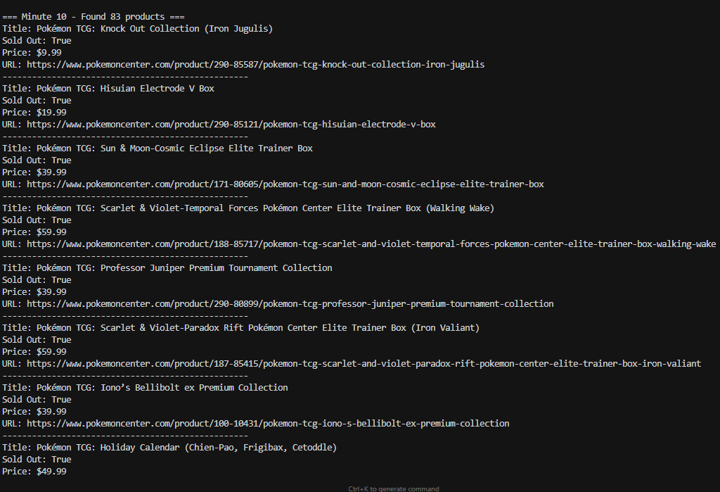 The script visits target products and checks availability, price, and product URL.